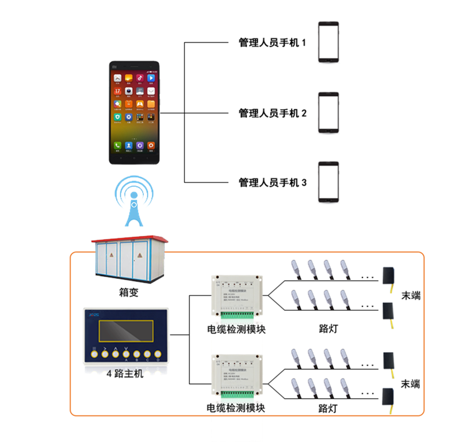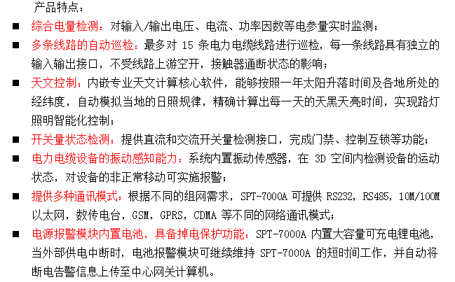 9. 電纜防盜報警,電纜被割斷、變壓器配電柜非法開門時,發出報警,可迅速確定報警位置和故障電纜,全天候24小時監控,白天路燈電纜無電時也可監控。