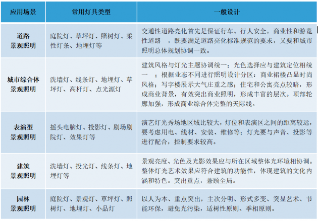 ? ? ? ? 按應(yīng)用場(chǎng)景區(qū)分:大致為道路景觀照明、城市綜合體景觀照明、園林景觀照明、建筑景觀照明、表演型景觀照明等。