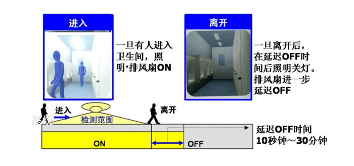? 針對衛生間照明的特點來設置時間和人體紅外感應控制,無人進入衛生間時系統開啟部分照明回路提供最基本的照明,當有人進入衛生間時,衛生間內的感應器返回數據,處理器控制衛生間的所有光源全部點亮,人離開后由時間控制器控制光源延時關閉,并且延時時間可重復設置。同時在衛生間入口或清潔作業間設置操作面板,實現全開、全關、半亮燈手動操作模式。