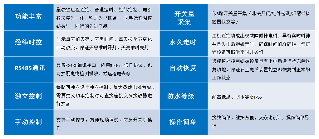 | 采用交流采樣的方法,采集頻率、電壓、電流、并進行有無功率、有無功電量、功率因數、漏電電流等數據的運算、處理、儲存; | 終端能保存全年365天的開關燈時間表,當與監控中心失去聯系時,會根據預先設定的程序自行開/關燈,以確保照明設施的正常運行。 |