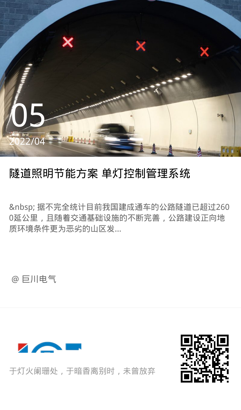 節能降耗、保障安全是建設和運營單位迫切需要解決的技術難題。巨川電氣科技隧道單燈智能照明控制系統可以節省電量的損耗,同時改善隧道內視覺享受,減輕駕駛員疲勞,有利于提高隧道通行能力保證交通安全。