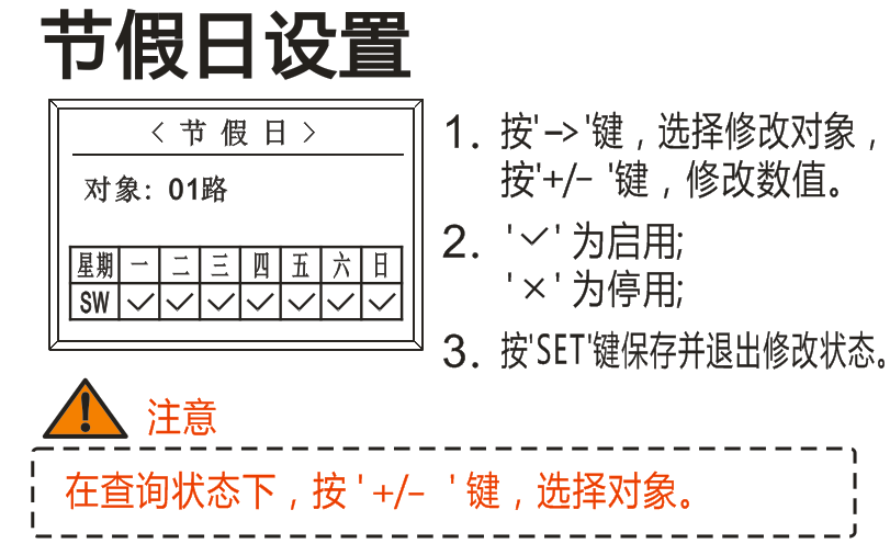 注:系統設置/時控設置/星期設置/光控設置 操作簡介,在查詢狀態下,通過‘+’‘-’鍵,可以翻頁選擇查詢不同回路的參數;按‘SET’鍵進入修改狀態,移動光標到目標位置,通過‘+’‘-’鍵,修改目標值,按‘SET’進行數據的保存,如在查詢狀態下,則退出返回到工作頁面。