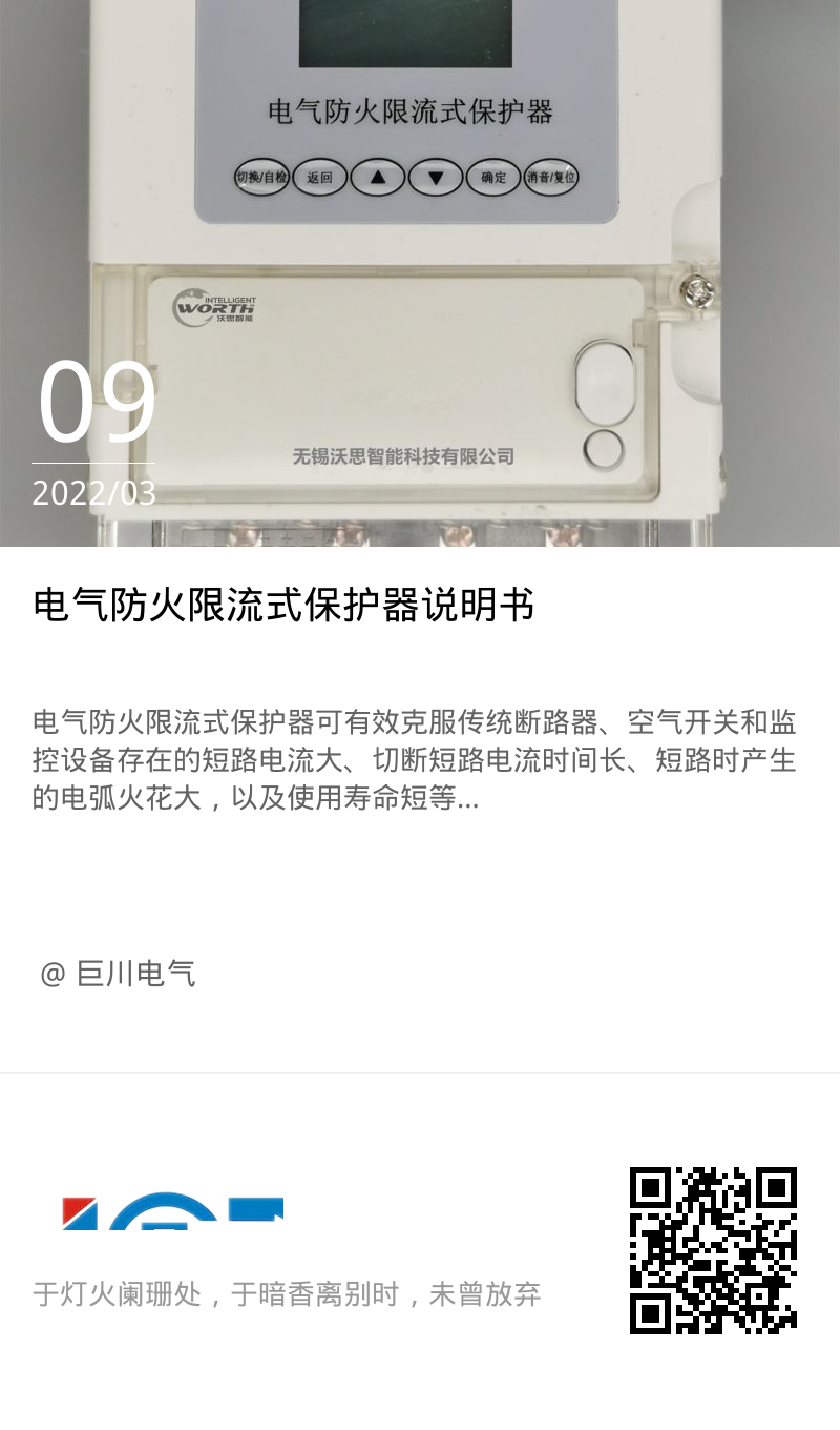 電氣防火限流式保護器可有效克服傳統(tǒng)斷路器、空氣開關(guān)和監(jiān)控設(shè)備存在的短路電流大、切斷短路電流時間長、短路時產(chǎn)生的電弧火花大,以及使用壽命短等弊端,發(fā)生短路故障時,能以微秒級速度快速限制短路電流以實現(xiàn)滅弧保護,從而能顯著減少電氣火災(zāi)事故,保障使用場所人員和財產(chǎn)的安全,是沃思智能新研發(fā)的產(chǎn)品之一。